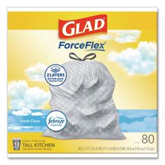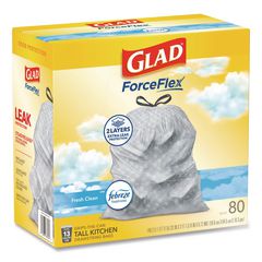 Let the stretchable strength of Glad® ForceFlex™ handle all the messes our busy daily life can throw at it and then some. Glad® Tall Kitchen Drawstring Trash Bags are designed with ForceFlex™ technology to give extra flex as it expands around sharp edges and heavy loads, so you can pack it in while resisting tears, rips and punctures. These trash bags are designed with two layers for extra leak protection. RipGuard® and LeakGuard® technology prevent seepage of liquids and keep trash contained. Fight nasty kitchen odors with the exclusive Glad® trash bag combination of steady release of Febreze freshness and irresistible scent that traps, locks and neutralizes odors. The durable Grips The Can Drawstring ensures a tight grip on the trash can to keep it in place. Take the trash to the curb with no fear of leaks and tears, and no frustration.